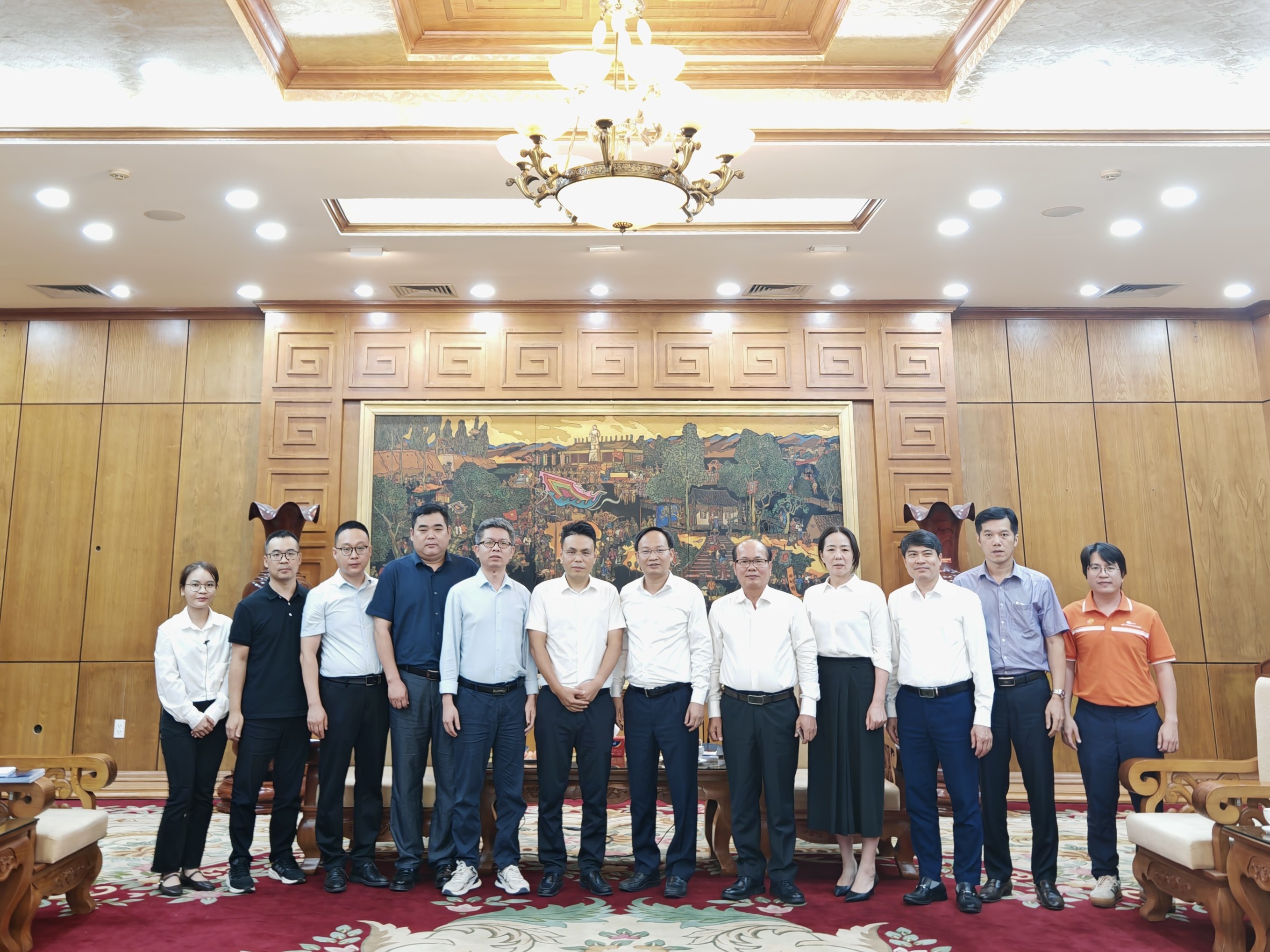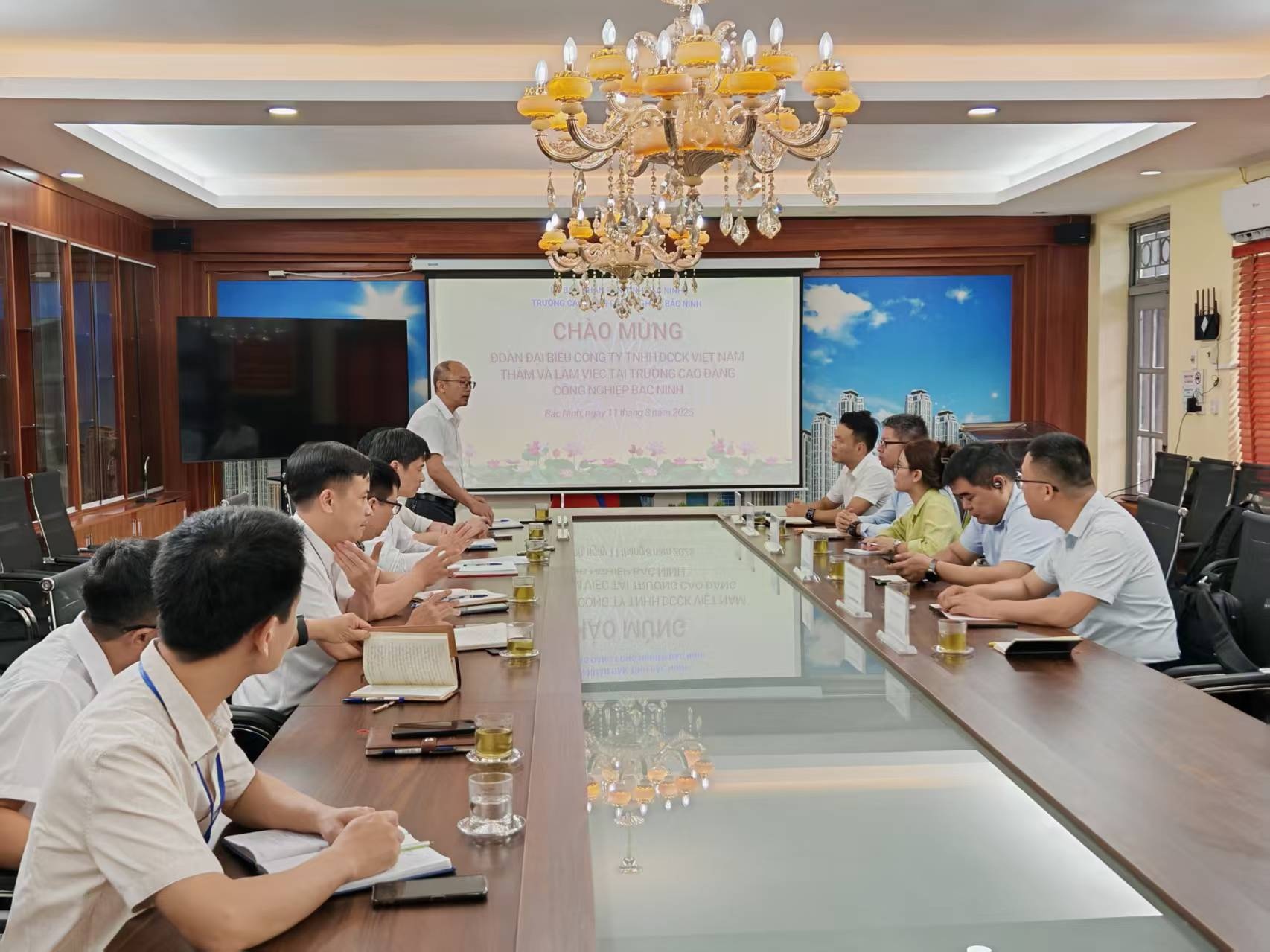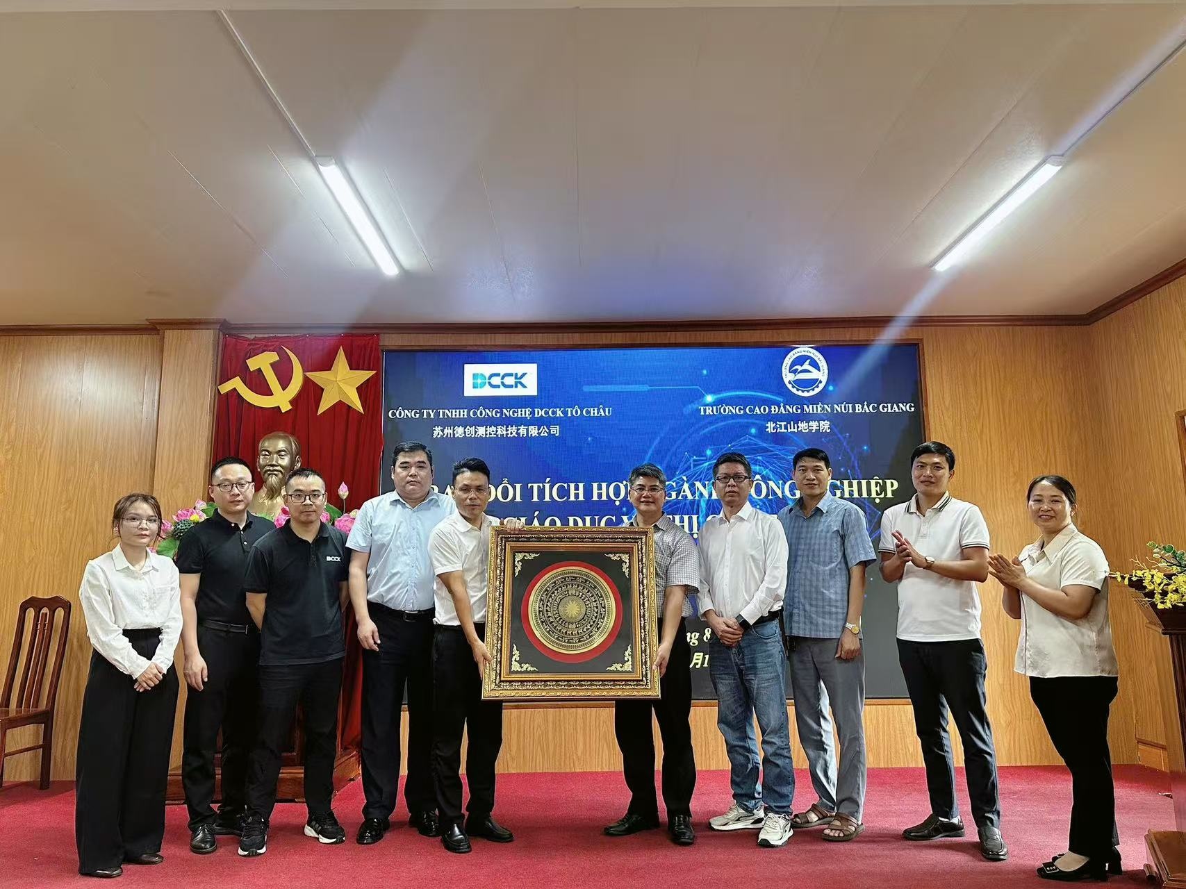 8月13日,德创集团董事长葛大伟率团访问越南北宁省,与北宁省人民委员会副主席范文盛在省人民委员会办公大楼举行会谈。参会人员包括北宁省教育局局长、北宁工业管理负责人、北宁职业培训负责人及四所高校校长等。双方围绕工业自动化技术合作、机器视觉产教融合及中越产业升级等议题展开深入交流,达成多项共识,进一步推动中越技术交流与人才培养,巩固德创集团在越南北宁工业区的战略布局.